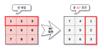 코딩테스트 문제를 풀다보면 이차원 배열을 시계방향으로 90도 회전할 일이 종종 있다.