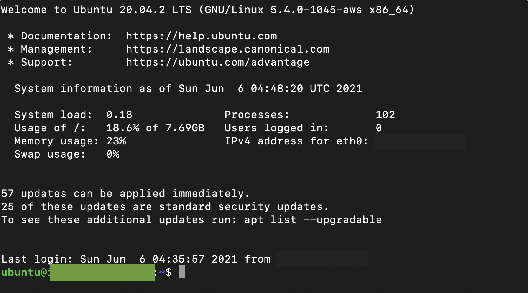 우선 터미널에서 내 인스턴스로 접근하는 방법은, 아래 명령어를 치면 된다. pem파일을 잃어버린다면 내 서버에 접근을 할 수 없으니 절대 잃어버리지 않도록 주의하자. (만약 permission 에러가 난다면 앞에 sudo를 써 주면 된다.)