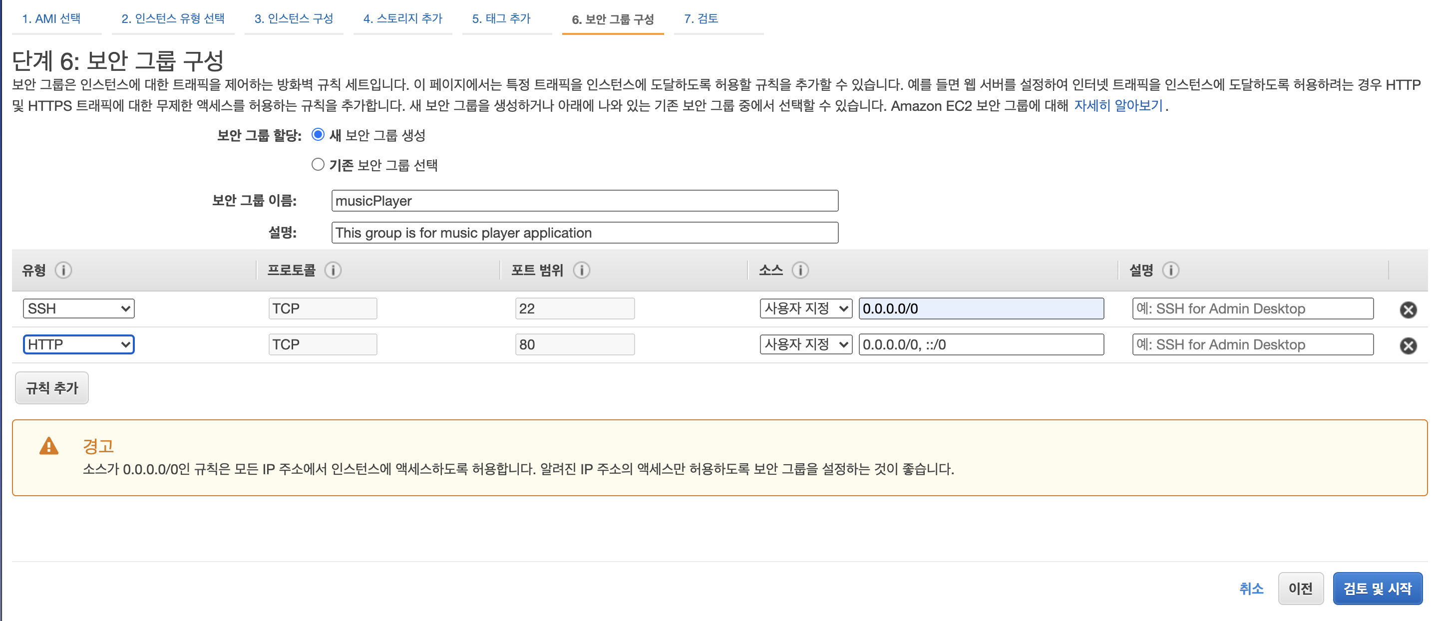 그 다음 보안 그룹 구성이 나올 때 까지 넘어간다.보안 그룹 구성에서 SSH유형은 추 후에 터미널에서 내 인스턴스로 접속하기 위해 허용을 해주고,