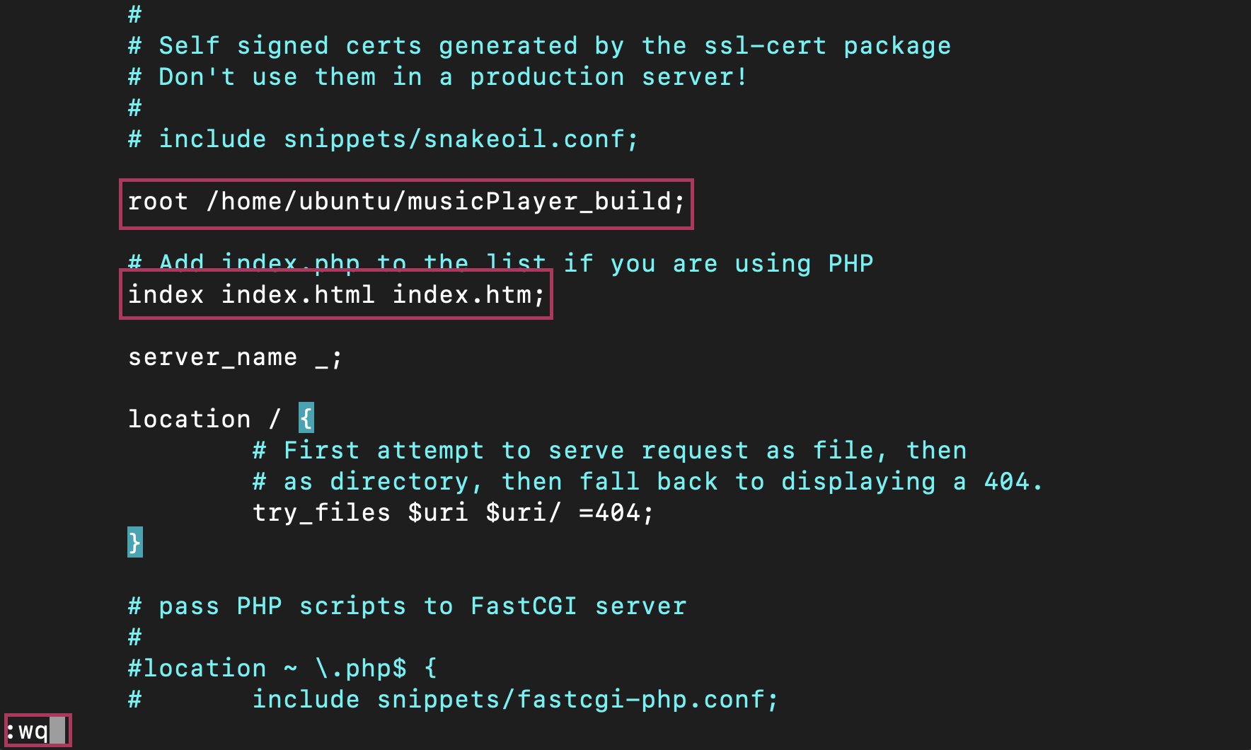 root /var/www/html; ➡ root /home/ubuntu(host 이름)/musicPlayer_build(내 빌드 파일이 담긴 폴더 이름)