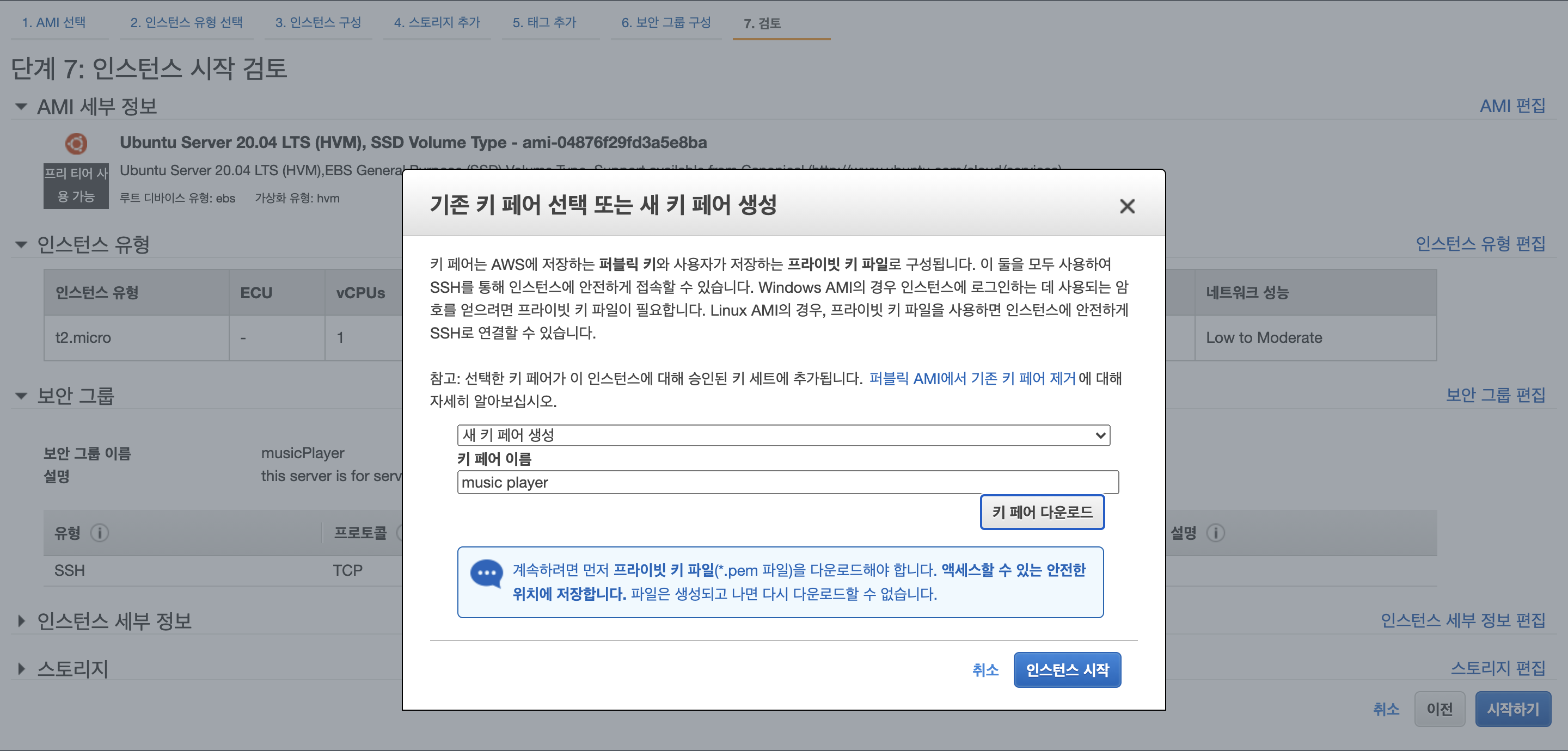 그러면 마지막에 키 페어를 선택하거나 새로운 키 페어를 생성하는 창이 생기는데, 처음 발급한다면 새 키 페어를 생성해서