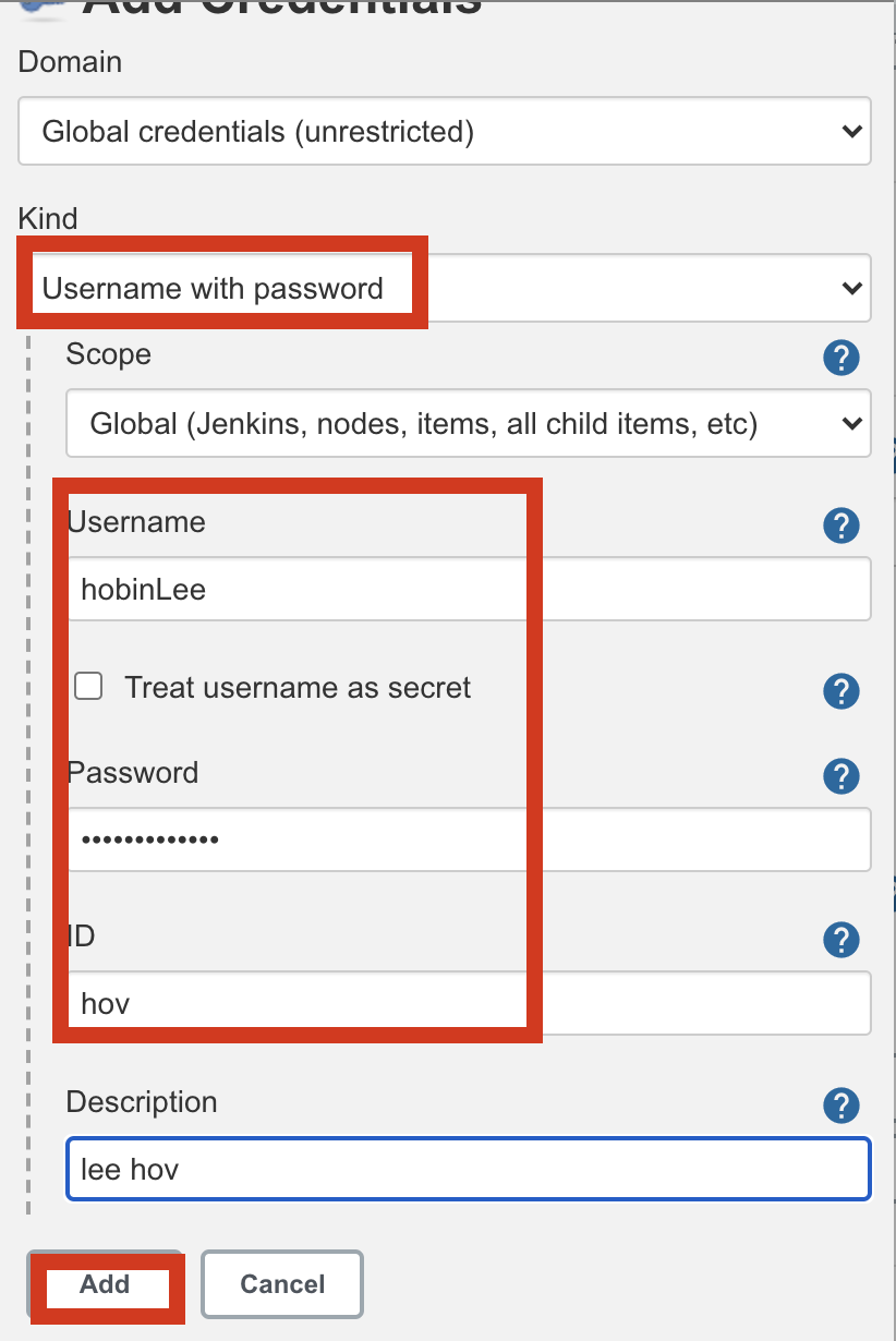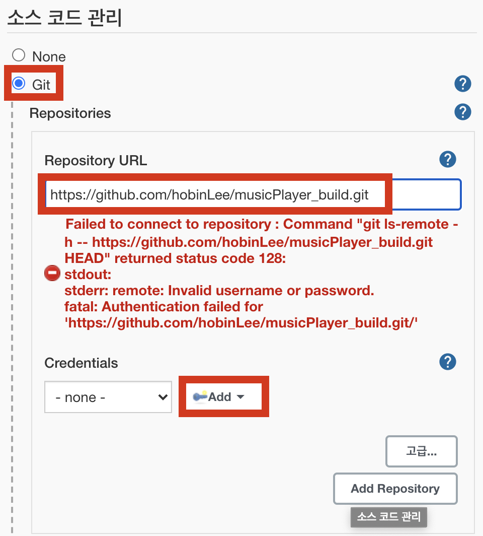 그 다음 GitHub Project 박스를 체크하고 repo의 url을 입력한 뒤, 소스코드 관리에서도 아래와 같이 Git을 선택한 후 URL에 repository의 url을 입력 해준다. 이번 프로젝트에서 Credential은 만든적이 없으므로 (조금전 환경설정에서 hook을 사용하기 위해 만든 credential과는 다른 프로젝트에 대한 권한이다.) Add를 눌러 새 계정을 만들어준다.