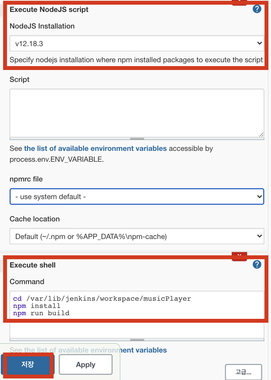 Add build step > Execute NodeJS script를 누른 뒤 NodeJS Installation의 버전을 조금전 만들었던 버전으로 추가한다.