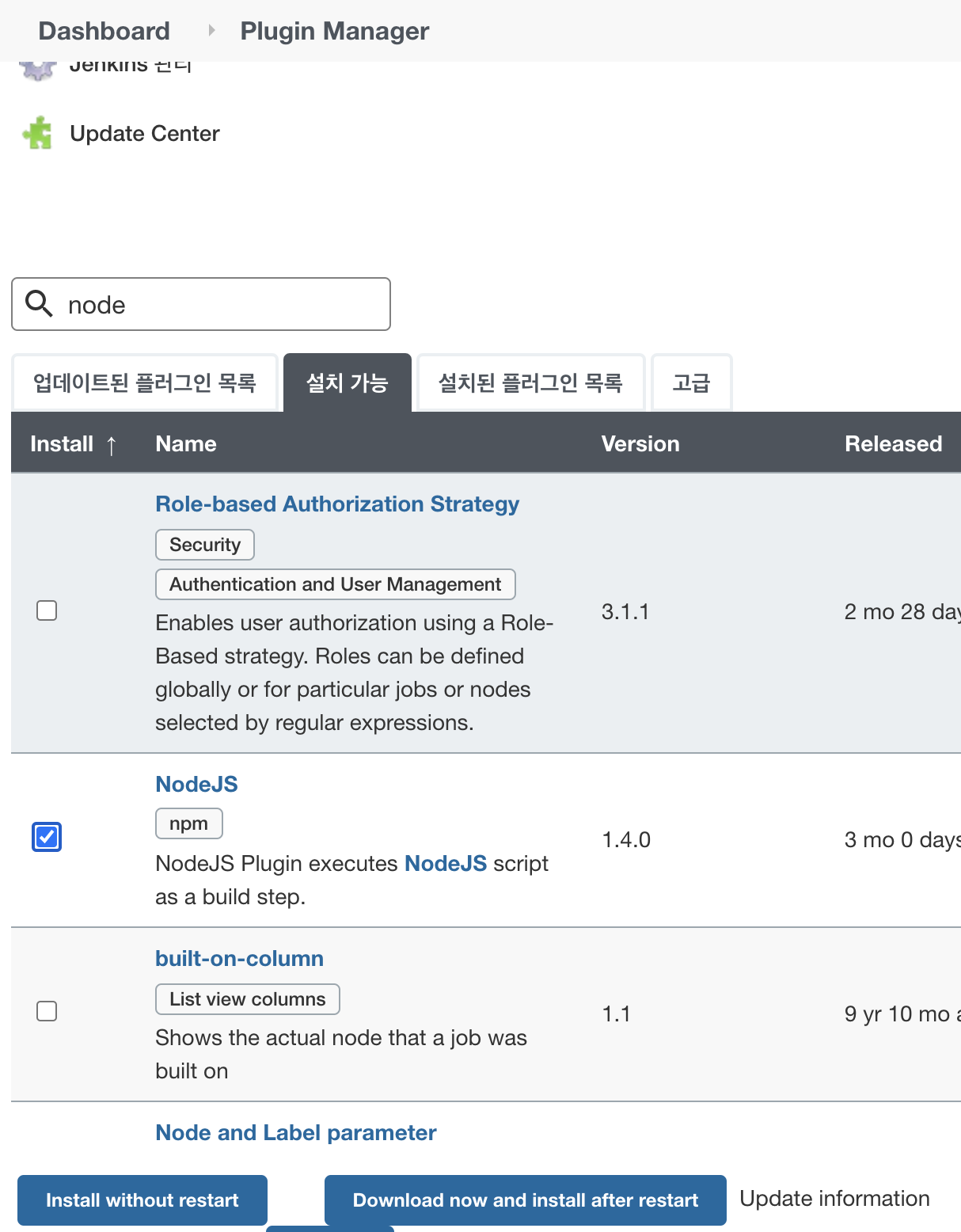 Jenkins 관리 > 플러그인 관리에 들어가서 NodeJS 플러그인을 설치한다.