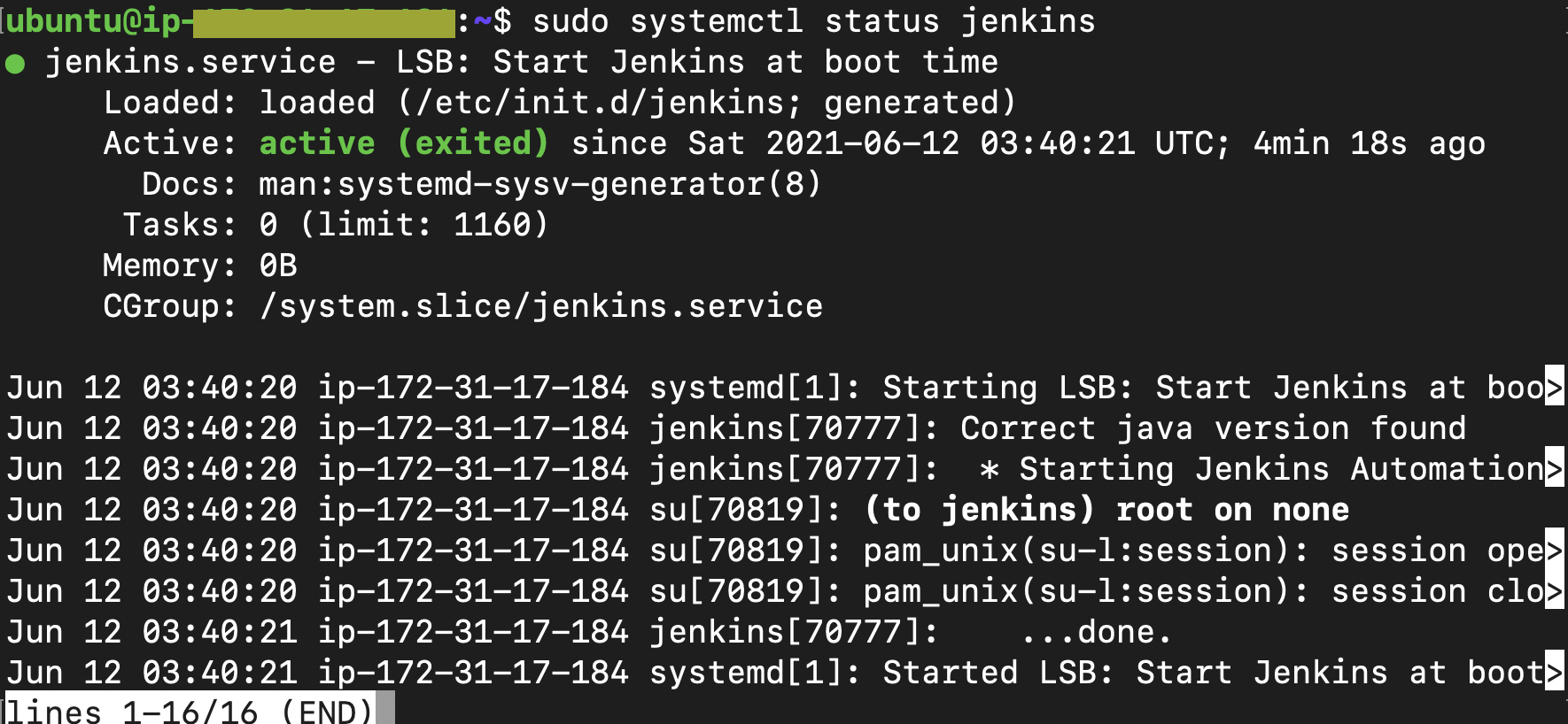$ sudo service jenkins restart이제 젠킨스 설치가 정상적으로 되었는지 아래 명령어를 입력해 확인해보면 된다.