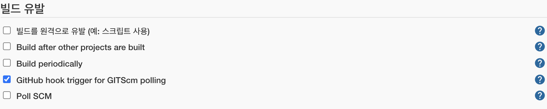 마지막으로 빌드 유발 조건에서 GitHub hook trigger for GITScm polling 란을 선택해준다.