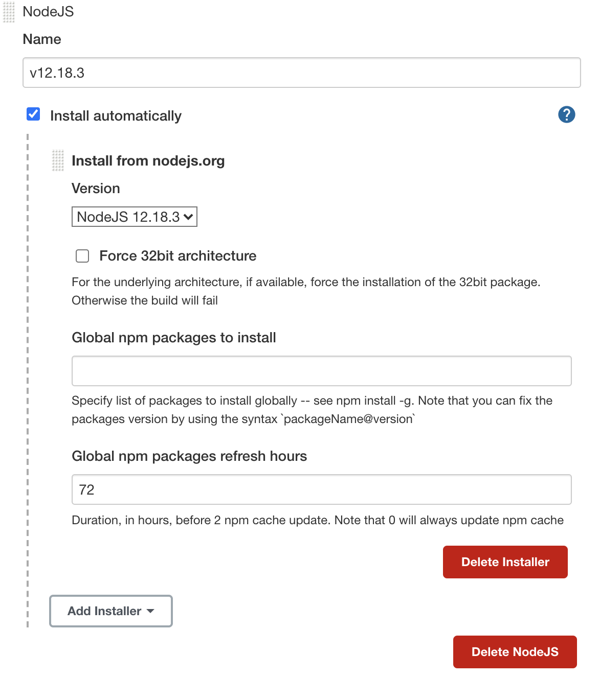 플러그인을 설치 했으면, 빌드에 사용할 nodeJS 버전을 정의 해야한다.