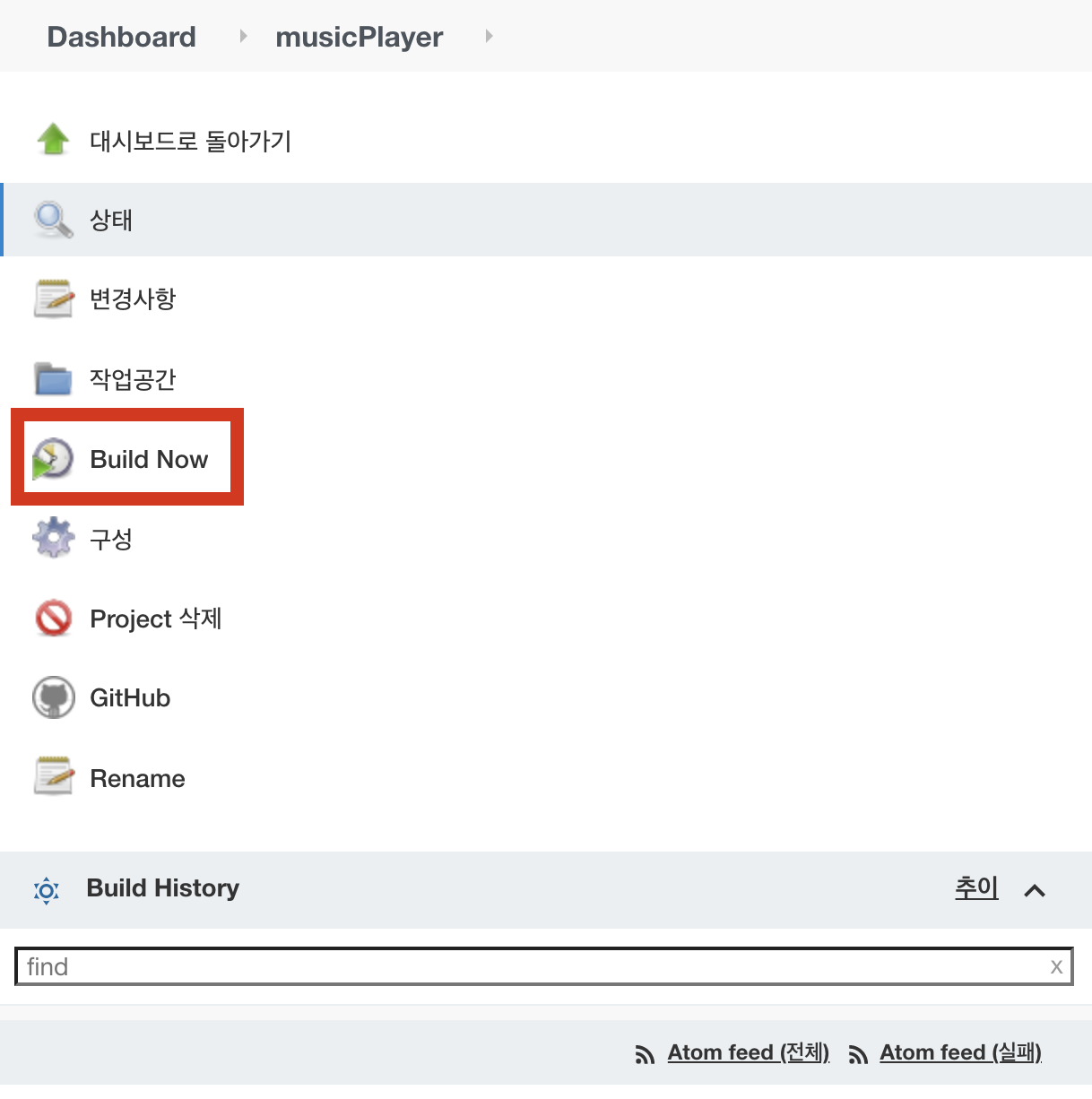 이 설정은 누군가.master branch에 push를 하면 이를 감지하여 자동으로 pull을 받고 build를 실행하도록 한다저장을 누르고 작업공간 생성을 위해서는 첫 빌드가 필요하다. 이를 위해서 Build Now를 클릭하게 되면 잠시 뒤 워크스페이스 디렉토리에 우리의 프로젝트가 정상적으로 생성되고 빌드까지 완수하는 것을 알 수 있다.
