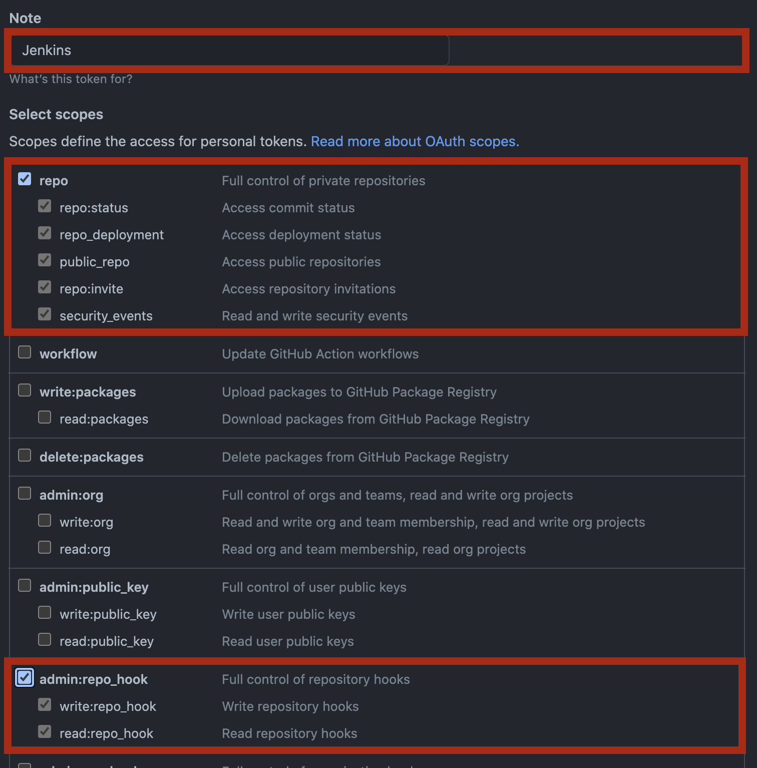 Generate new token 버튼을 클릭한다.Token description에 토큰의 이름을 작성하고 Select scopes에서 reop, admin:repo_hook을 체크하고 토큰을 생성한다.