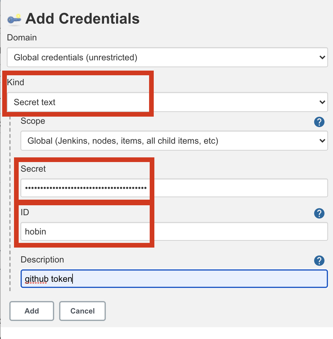 Jenkins관리 > 시스템 설정 > Github탭 > 고급 > Github Servers > Add Github Server를 클릭한다서버 이름을 설정 하고 Credentials에서 add 탭을 눌러 새로운 credential을 만든다.