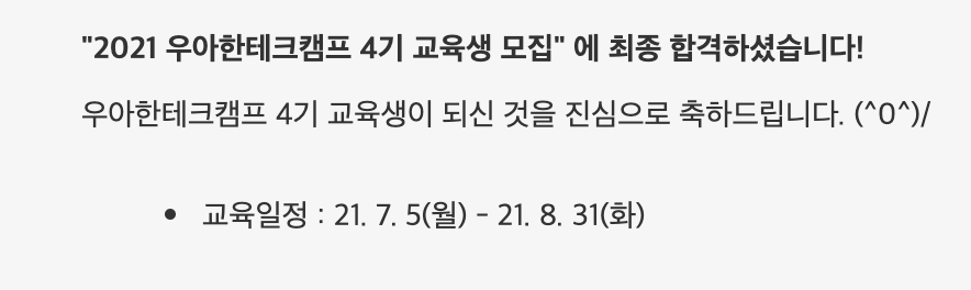 우아한테크캠프 4기 최종 합격 후기Activity/우아한테크캠프 4기 2021. 6. 25. 13:59