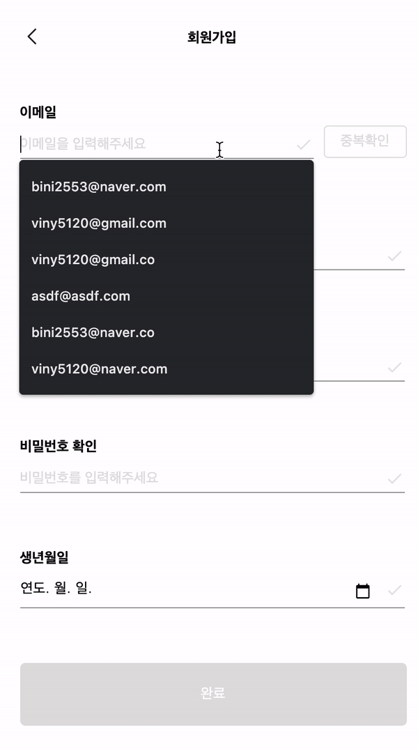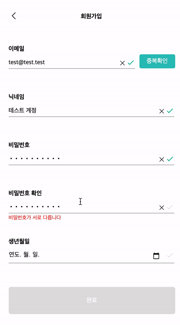 내가 맡았던 부분은 회원가입 페이지다! 변경되는 입력값마다 validation 체크를 해 주는 detail에 신경을 많이 썼다~!