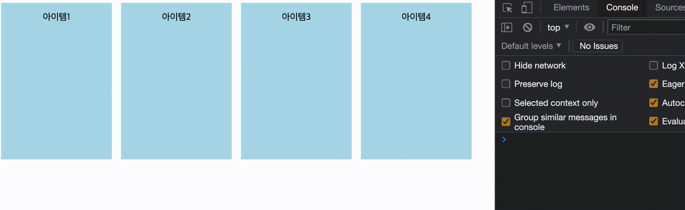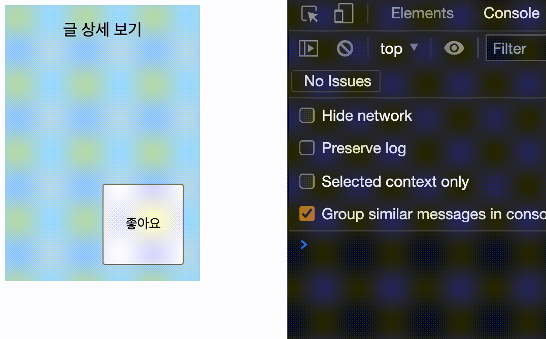 <div class="item"> 글 상세 보기 <button class="like-button"> 좋아요 </button> </div>const $itemBTN = document.querySelector(".item"); const $likeBTN = $itemBTN.querySelector(".like-button"); $itemBTN.addEventListener("click", () => { console.log("상세 게시글로 이동!"); }); $likeBTN.addEventListener("click", () => { console.log("해당 제품 좋아요 / 좋아요 해제"); });자 그럼 여기서 파란 영역을 누르면 당연히 "상세 게시글로 이동!" 이라는 문구가 출력될 것이고, 내부 버튼을 클릭하면 "해당 제품 좋아요 / 좋아요 해제" 라는 문구가 나올 거라 예상한다. 하지만 결과를 보면 다음과 같다.
